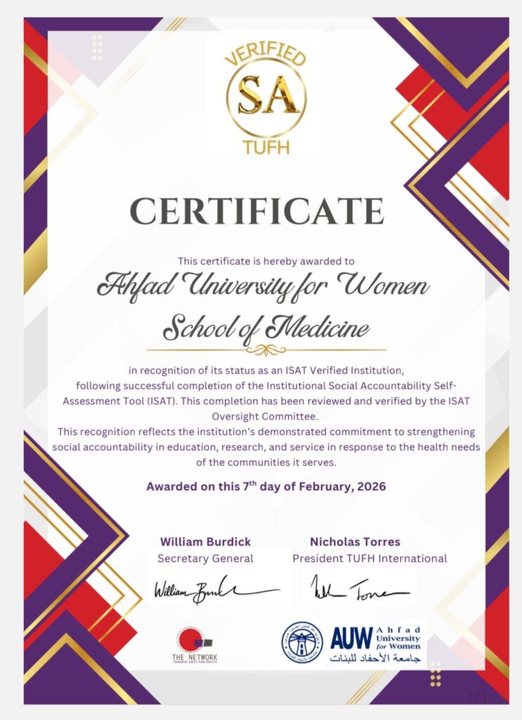 ISAT Verified Institution Certificate awarded to Ahfad University for Women (AUW), School of Medicine This certificate formally recognizes the school’s successful completion of the Institutional Social Accountability Self-Assessment Tool (ISAT). This is a rigorous evaluative framework designed by the international network Towards Unity For Health (TUFH) to measure and strengthen alignment between academic activities and community health needs. Reviewed and validated by the ISAT Global Oversight Committee, this distinction signifies not only compliance with established standards but a demonstrable, evidence-based commitment of AUW to advancing social accountability across education, research, and service domains. Conferred by TUFH International, the certificate underscores the institution’s leadership in integrating community-responsive practices within medical training, positioning it globally among a select group of institutions that have achieved verified status through a structured, internationally recognized assessment process