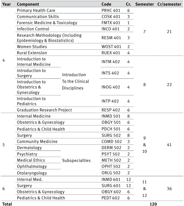 The remaining bulk of the phase is devoted to the hospital-based training program (Clerkship). Students undertake clinical training in the major medical and surgical disciplines, with primary focus on core rotations in Medicine, Surgery, Obstetrics & Gynecology, and Pediatrics & Child Health as well as in clinical subspecialties such as Psychiatry, Dermatology, Orthopedics, Ear-Nose & Throat and Ophthalmology at different university allied hospitals and specialized centres. Their training program contains clinical work at patients’ wards, outpatient clinics and emergency departments, supplemented by didactic sessions to consolidate their knowledge base as well as integration of the basic sciences.