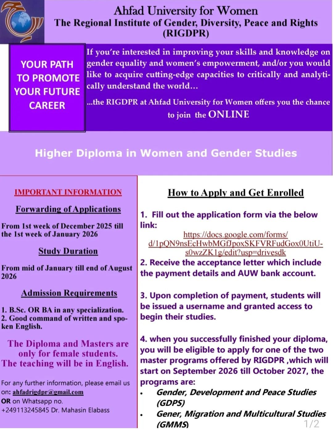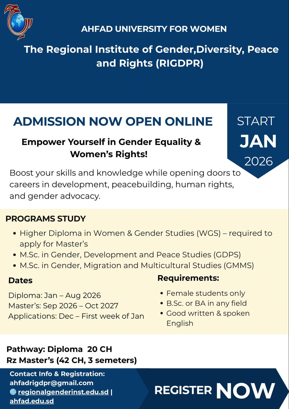 The Regional Institute of Gender, Diversity, Peace and Rights announces the opening of application process for its programs online.